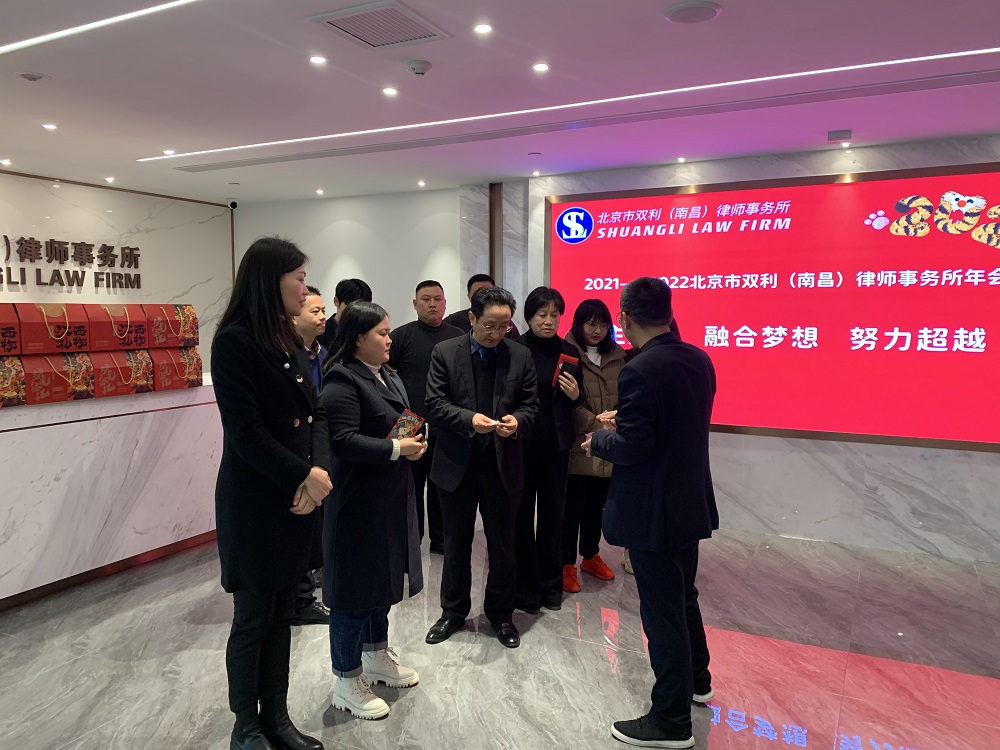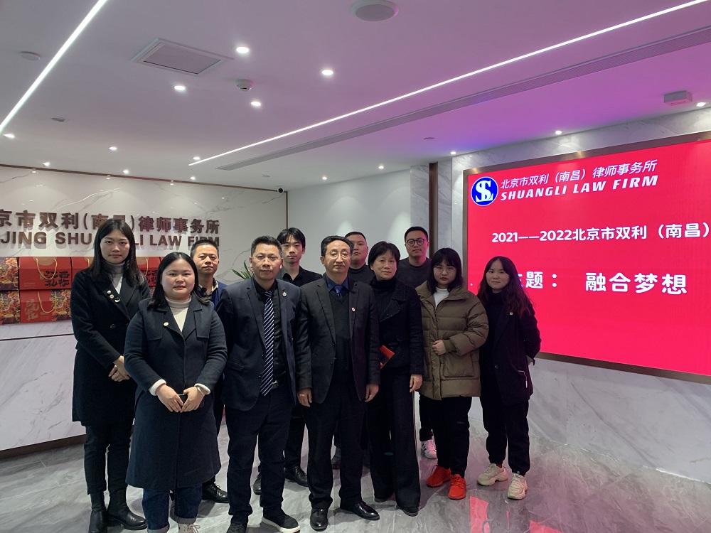 律回春晖渐,万象始更新。2022年1月24日,北京市双利(南昌)律师事务所全体同仁在律所召开“融合梦想、努力超越”为主题的2021年度总结表彰大会暨2022年迎新会。会上,黄献华主任与高级合伙人杨秋林博士发表了致辞,总结2021年优秀成绩、谋划2022年发展布局。